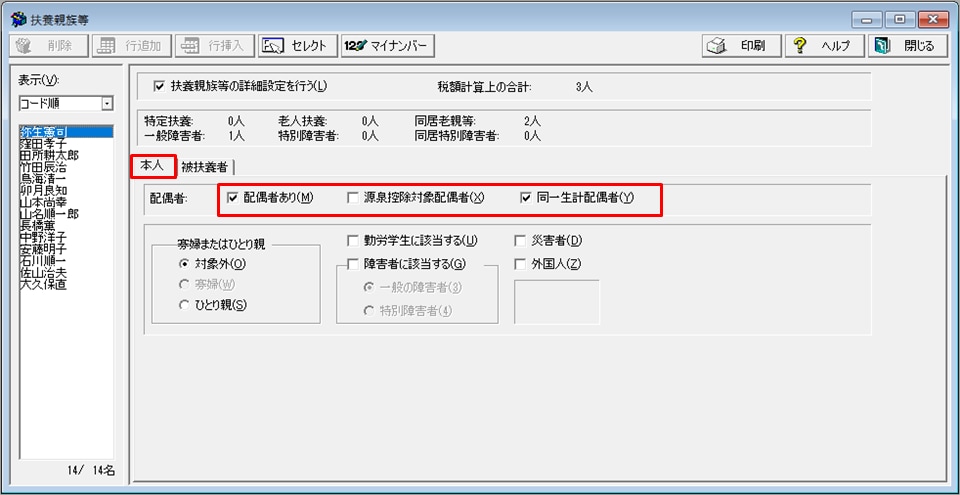 ⇒[源泉控除対象配偶者][同一生計配偶者]の両方にチェックを付けます。 - 扶養親族の追加