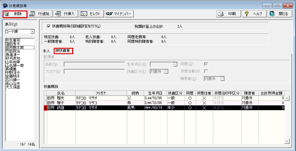 税額計算上の人数に含まれたままになり所得税が正しく計算されませんので、必ず下記の手順で扶養親族を削除してください。- [被扶養者]タブから削除する扶養親族の左横にある小さな四角(行セレクター)をクリックして、行を黒く反転させます。