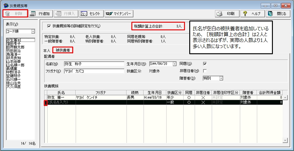 税額計算上の合計人数に含まれたままになり所得税が正しく計算されませんので、扶養親族を削除する場合は、必ず下記手順で操作を行ってください。
