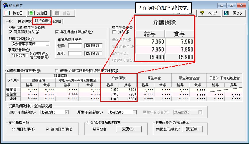 - [社会保険]タブの[保険料(掛金)負担率]の[健康保険]および[介護保険]の保険料率を手入力で変更します。