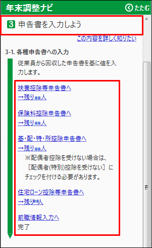 年末調整ナビの[3.申告書の入力をしよう]をクリックして、従業員から回収した申告書を基に、入力をします。