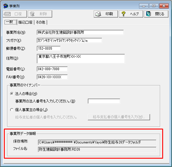- [事業所データ情報]に表示されている[保存場所]と[ファイル名]を確認し、メモなどに控えます。