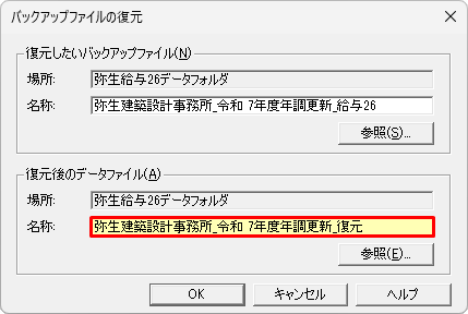 年末調整年度更新時に保存したバックアップファイルを指定します。