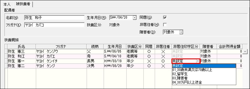 源泉徴収票の控除対象扶養親族の「区分」に、非居住者に該当する要件に応じた数字(01、02、03、04)を印字するには、年末調整ナビの[扶養控除等情報入力]画面(または給与本体の[扶養控除等]画面)で[非居住印字区分]を設定します。