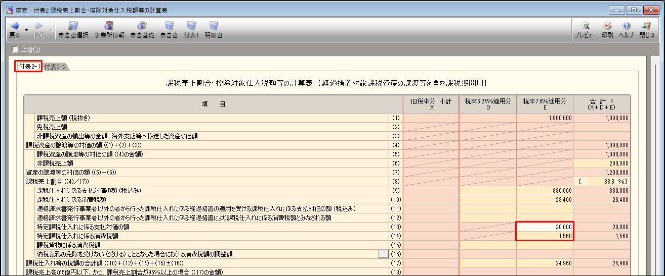 [付表1 税率別消費税額計算表 兼 地方消費税の課税標準となる消費税額計算表]画面が表示されます。 - 「(1)-2」の「E」に、手順1で確認した金額を入力します。