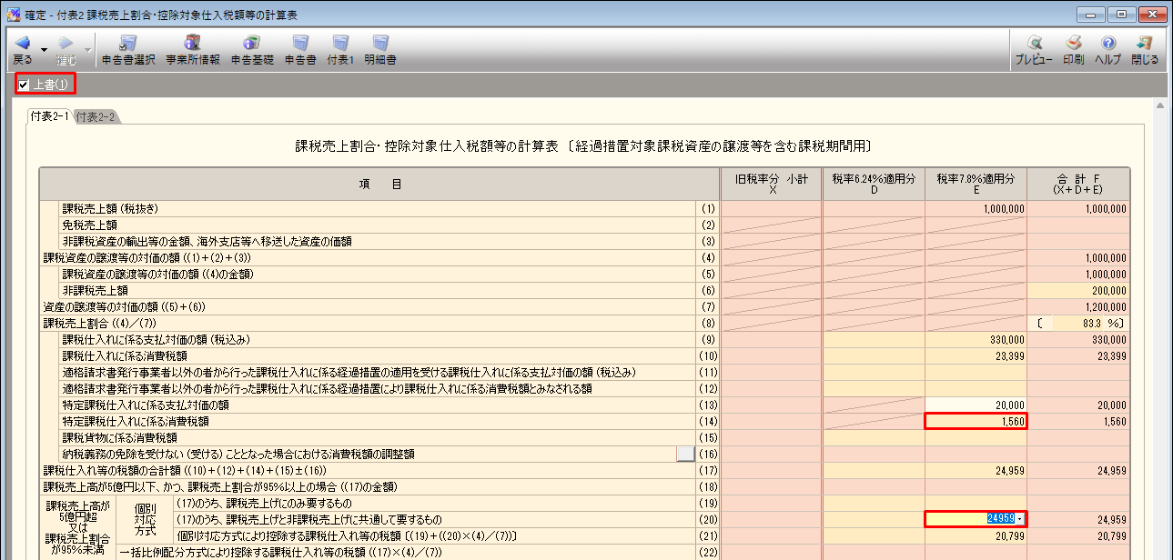 「(14)」の「E」が自動計算されます。 - 「(20)」の「E」金額欄を選択し、[上書]のチェックを付け、特定課税仕入れに関する消費額「(14)」の「E」(リバースチャージ方式に該当する取引の消費税額)を足した金額を入力します。