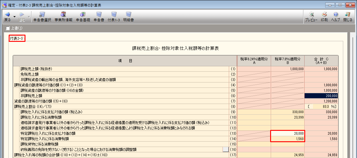 [付表2-3 課税売上割合・控除対象仕入税額等の計算表]画面が表示されます。 - 「(13)」の「B」に手順1で確認した金額を入力します。