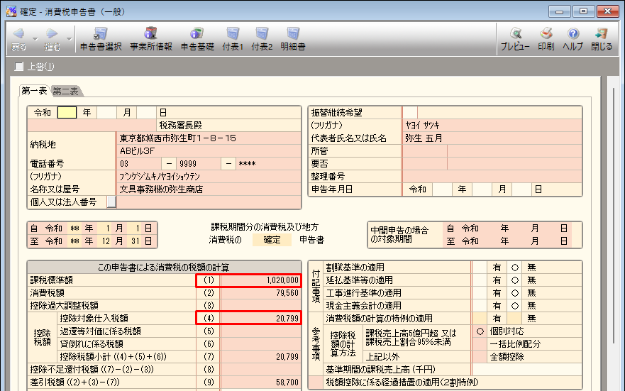 - [課税標準額(1)]に手順1で確認した金額が、[控除対象仕入税額(4)]に手順4で上書きした消費税額が、それぞれ反映しているのを確認します。