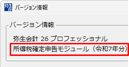 弥生会計(やよいの青色申告)を起動して、[ヘルプ]メニューの[バージョン情報]をクリックし、[所得税確定申告モジュール(令和7年分)]が表示されていることを確認します。