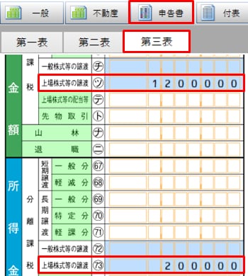 入力内容は[1面]タブに転記されます。 - [申告書]をクリックして所得税確定申告書を表示し、[第三表]に数字が転記されていることを確認します。