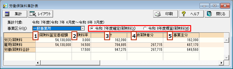 労働保険料集計表で「年度」を選択した場合に集計される内容は、以下のとおりです。