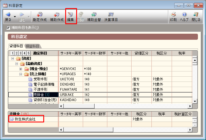 ここでは[売掛金]の補助科目「弥生株式会社」の末尾のスペースを削除します。「弥生株式会社」を選択して[編集]をクリックします。 - 末尾のスペースを削除して[OK]をクリックします。