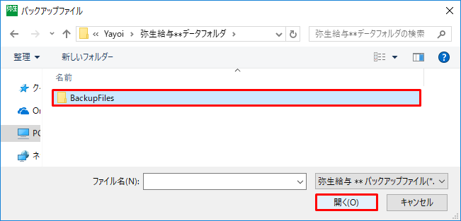 [BackupFiles]フォルダーを選択して[開く]をクリックします。