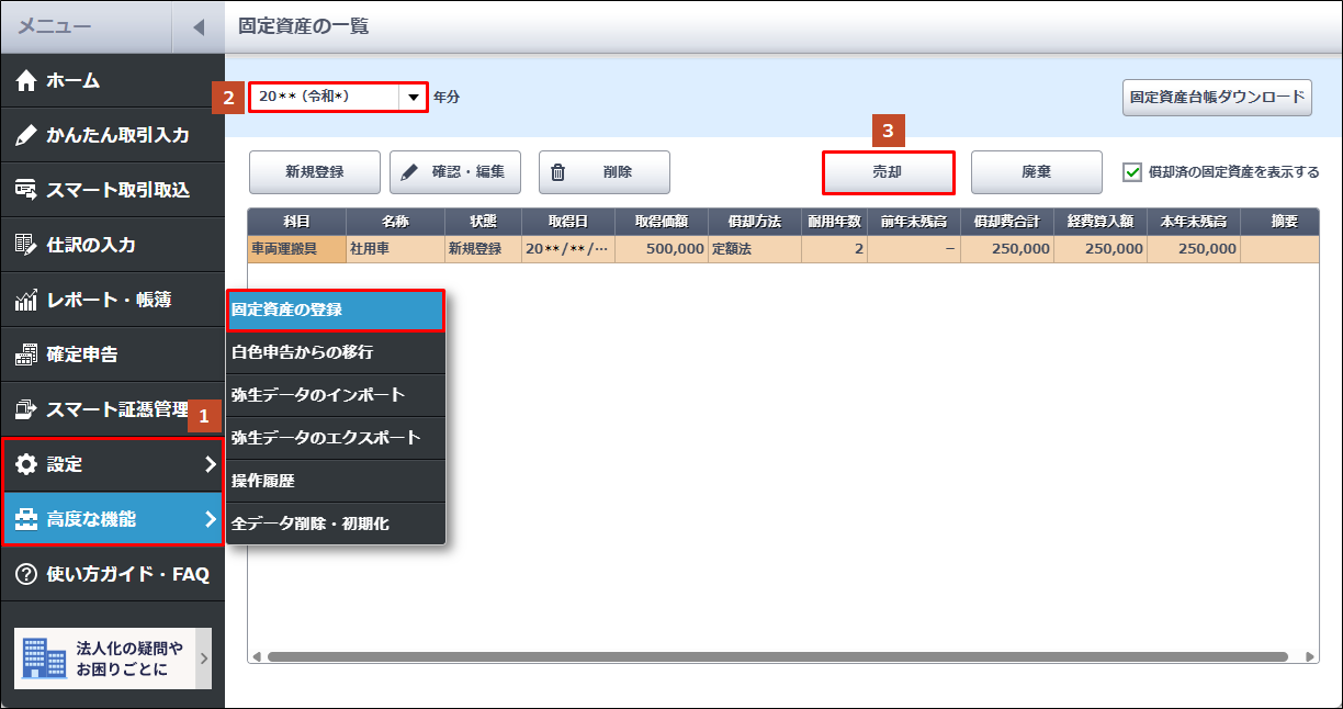 - メニューの[高度な機能]から[固定資産の登録]をクリックします。