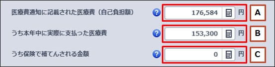 通知が複数ある場合は、すべての金額を合算して合計金額として入力します。B うち本年中に実際に支払った医療費 Aで入力した金額のうち、その年中に実際に支払った金額を入力します。実際に支払った金額が不明の場合は領収書等で確認してください。Aと同額になることもあります。 C うち保険で補てんされる金額 Bで入力した金額のうち、生命保険契約などで支給される入院費給付金や健康保険などで支給される高額療養費・家族療養費・出産育児一時金がある場合にその金額を入力します。 - 医療費通知に記載のない医療費や、交通費を入力します。
