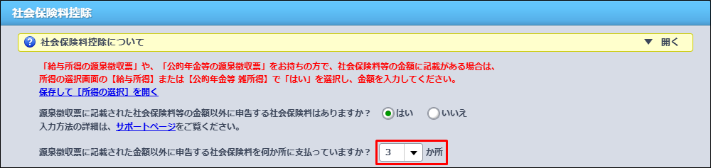 国民年金、国民健康保険、介護保険の3種類を支払っている場合、「源泉徴収票に記載された金額以外に申告する生命保険料・個人年金保険料・介護医療保険料を何か所に支払っていますか?」は「3か所」と選択します。