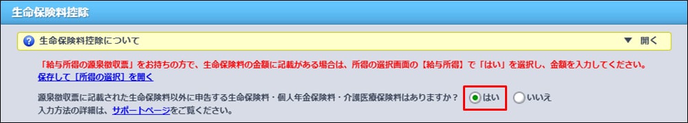 事業以外で給与所得がある場合の入力方法 - 給与所得はない、または給与所得の年末調整で控除を受けていない保険料がある場合[はい]を選択します。