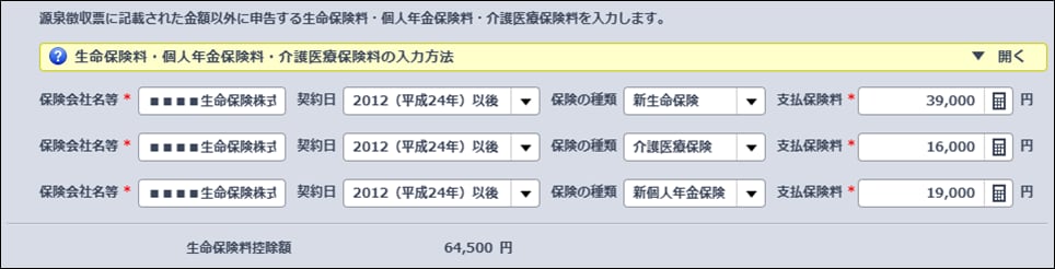 以下の例だと、「源泉徴収票に記載された金額以外に申告する生命保険料・個人年金保険料・介護医療保険料を何か所に支払っていますか?」は「3か所」と選択します。■■■■生命保険株式会社 制度 新制度 区分 一般:39,000円