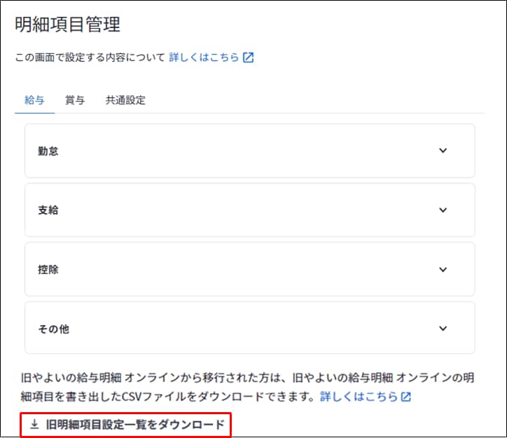 旧やよいの給与明細 オンラインからデータを移行した場合、旧バージョンで使用していた明細項目の設定をCSVファイルでダウンロードして確認することができます。