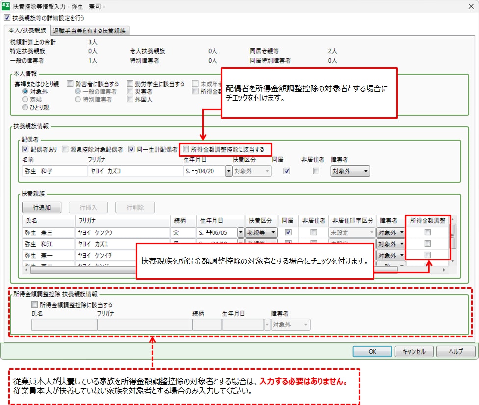 従業員本人が扶養している家族を所得金額調整控除の対象者とする場合は、[所得金額調整控除 扶養親族情報]を入力する必要はありません。