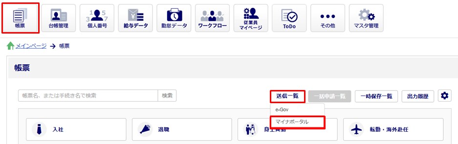 - [帳票]>[送信一覧]>[マイナポータル]をクリックします。