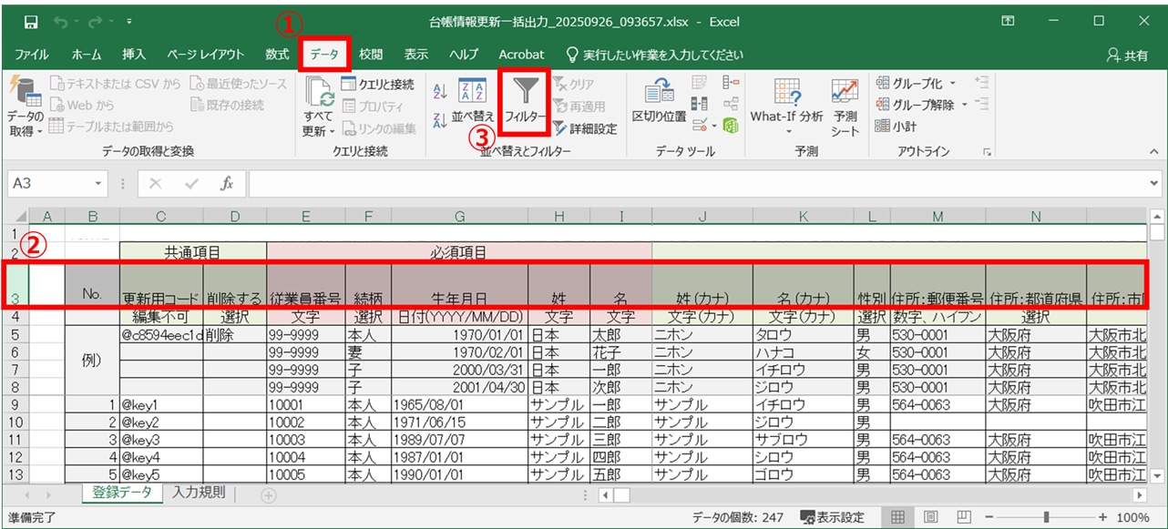 各保険の被保険者のみをご確認希望の場合等は、Excelの「フィルター」機能をご利用ください。