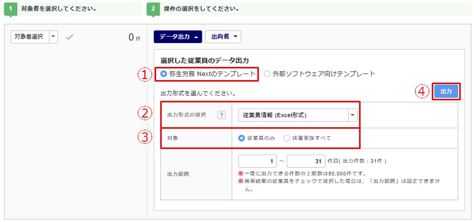 - 「弥生労務 Nextのテンプレート」(①)を選択、「出力形式の選択:従業員情報(Excel形式)」(②)を選択します。