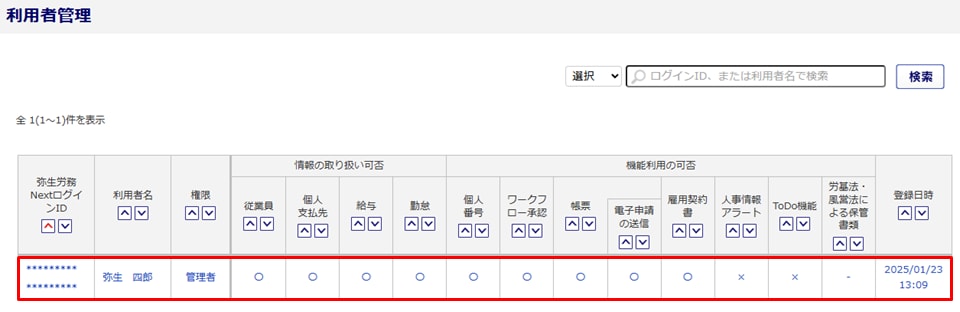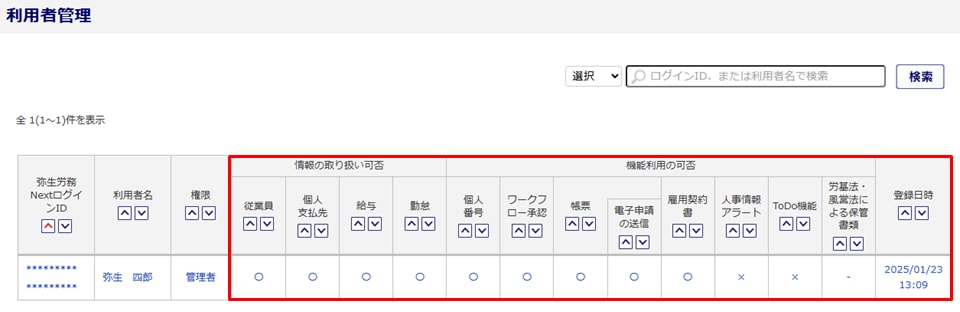 ※表示されていない場合は、管理者権限を持つログイン者に操作を依頼してください。 - 利用者の権限を確認します。