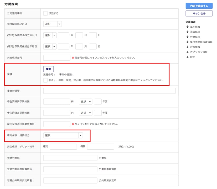 - 「業種」と「雇用保険 特掲区分」を設定します。