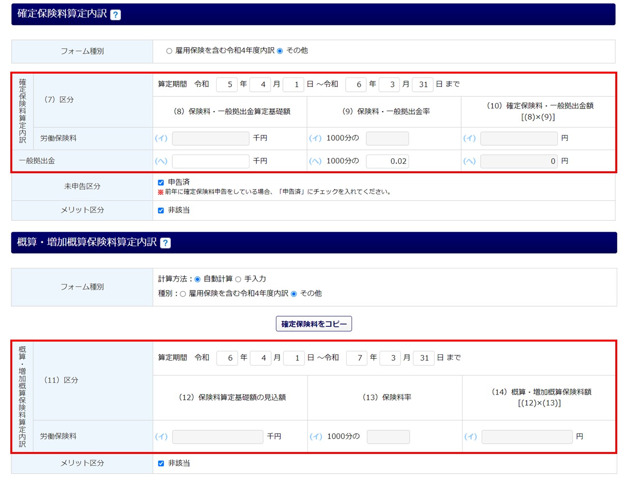 [企業設定]にて情報を登録するか、申告書画面にて「保険関係成立区分」を選択してください。