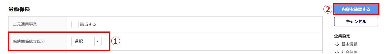 - 「保険関係成立区分」(①)を設定し、[内容を確認する](②)をクリックします。