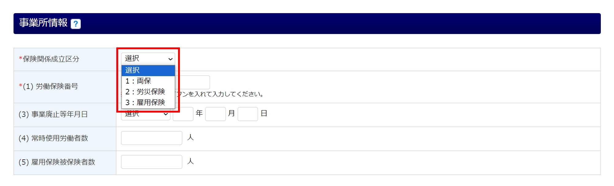 申告書の入力をおこなう画面「事業所情報」の「保険関係成立区分」にて区分を選択します。