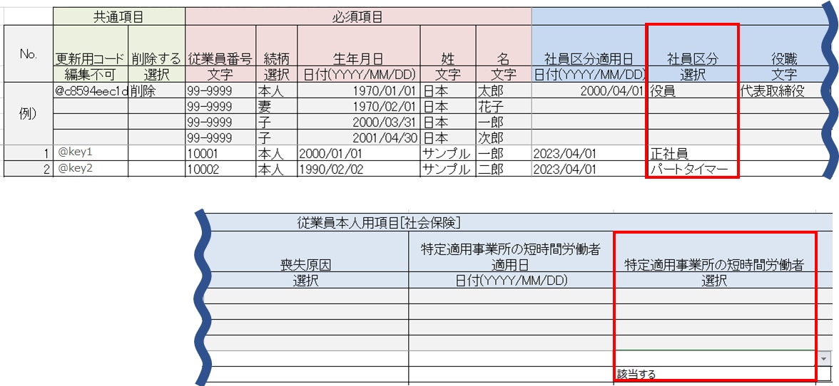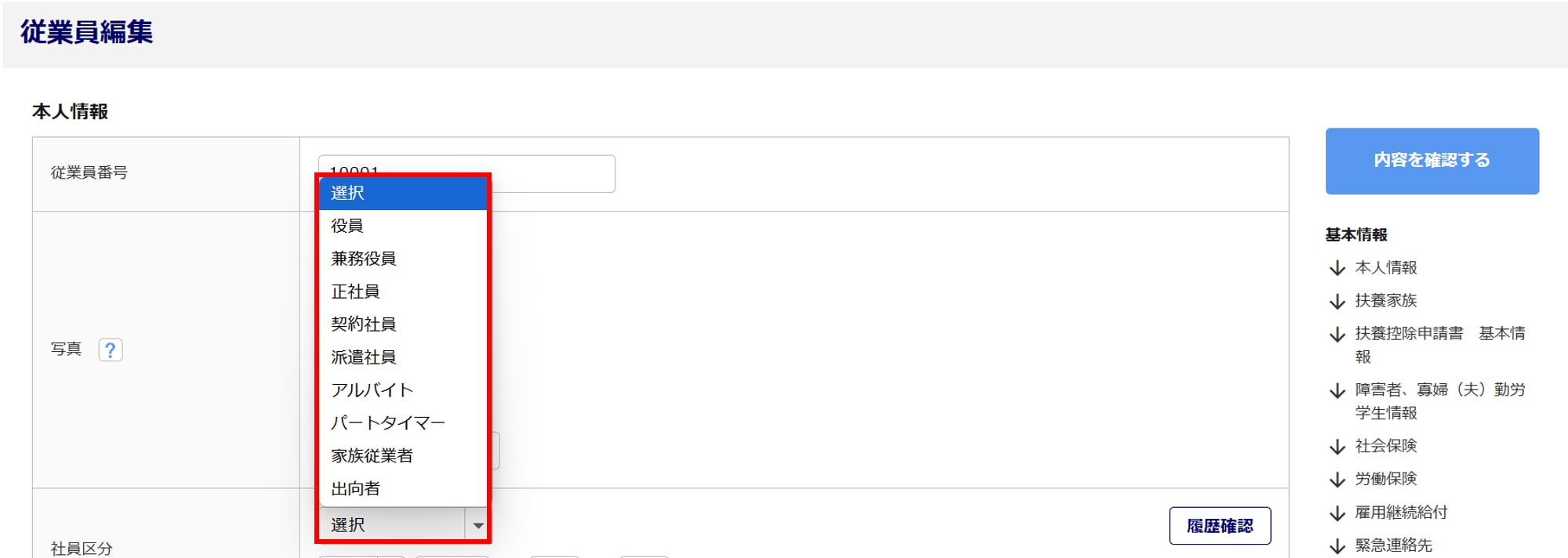 従業員本人用項目内「社員区分」をプルダウンから選択します。 - 「短時間労働者(特定適用事業所)」と設定したい場合