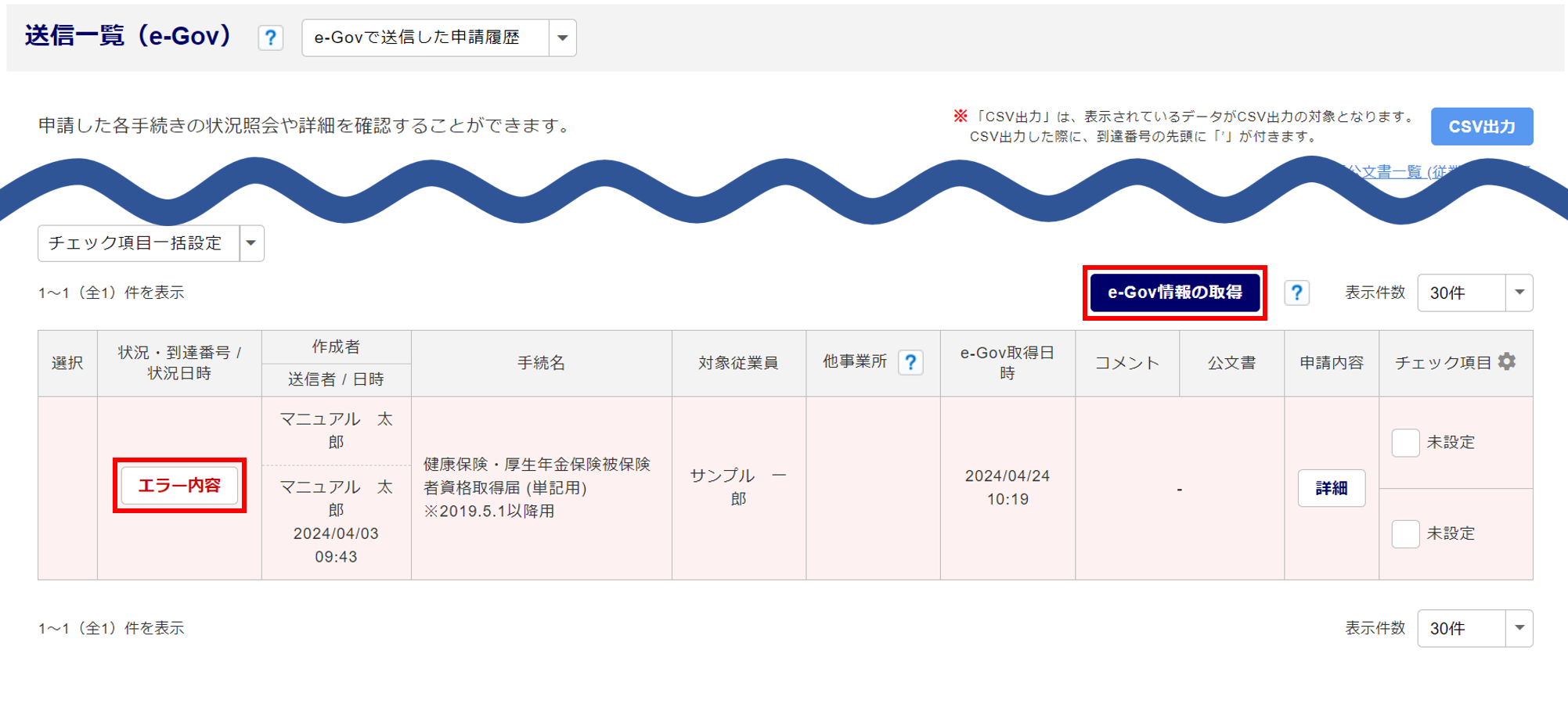 エラーとなっている申請の「状況・到達番号/状況日時」列の[エラー内容]をクリックします。