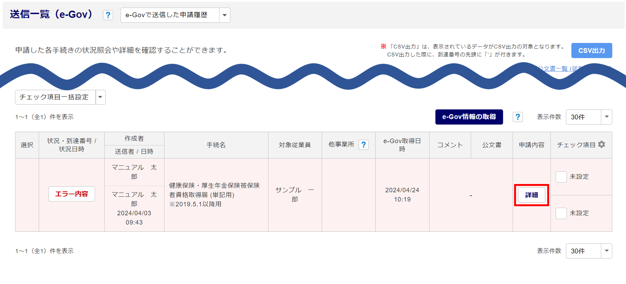 - 「送信一覧」画面にて、エラーとなっている申請の「申請内容」列の[詳細]をクリックします。