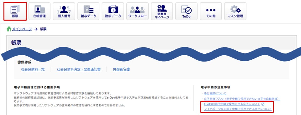また、[帳票]>「帳票」画面下部「電子申請の注意事項」の[e-Govの電子申請で使用できる文字について][マイナポータルの電子申請で使用できる文字について]をクリックすると確認できます。
