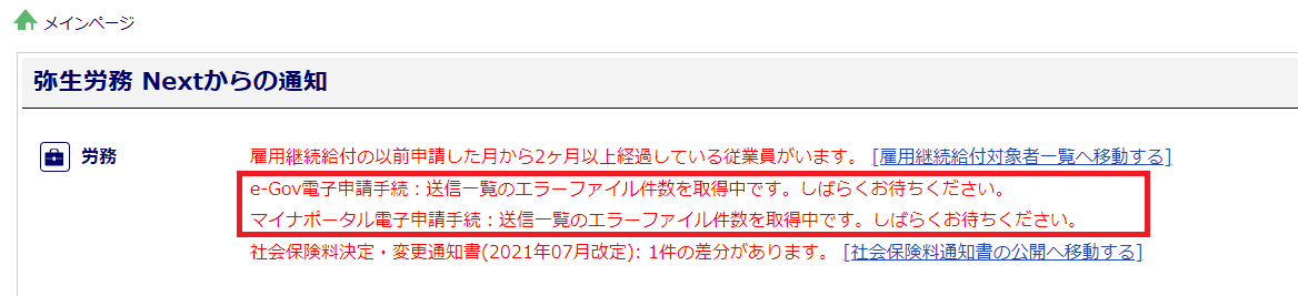 メインページ[雇用継続給付対象者一覧へ移動する]から操作時に、エラーが生じる可能性がございます。