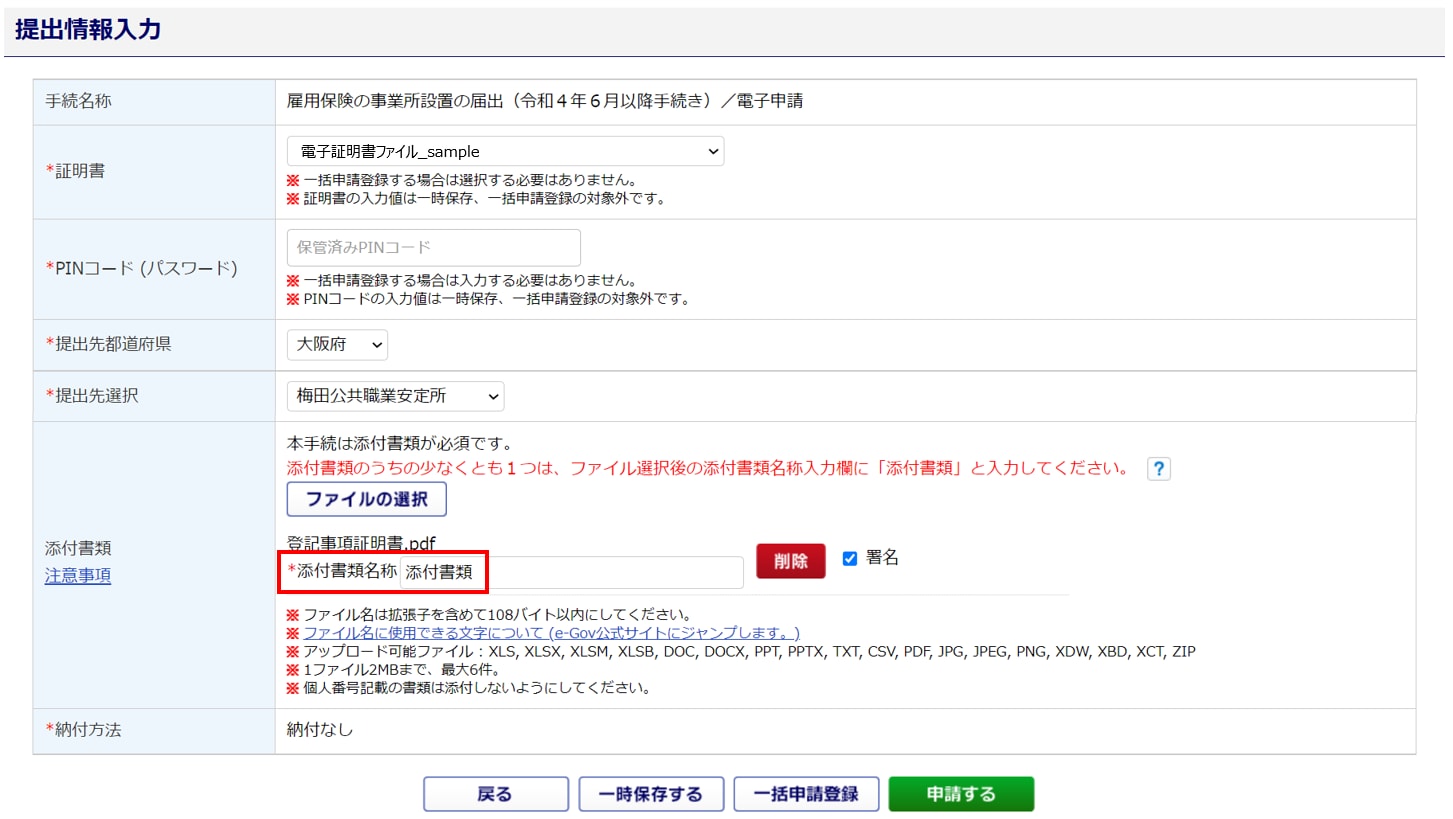 また、「雇用保険の事業所設置の届出」 手続き時、[ファイルの選択]から添付書類を選択をおこなうと、1つめの添付書類は、「添付書類」という名称に自動変換します。添付書類名称の変更はお控えください。