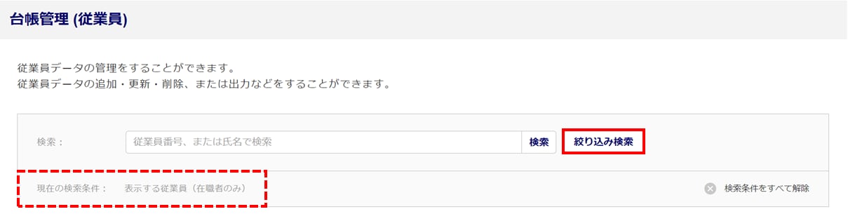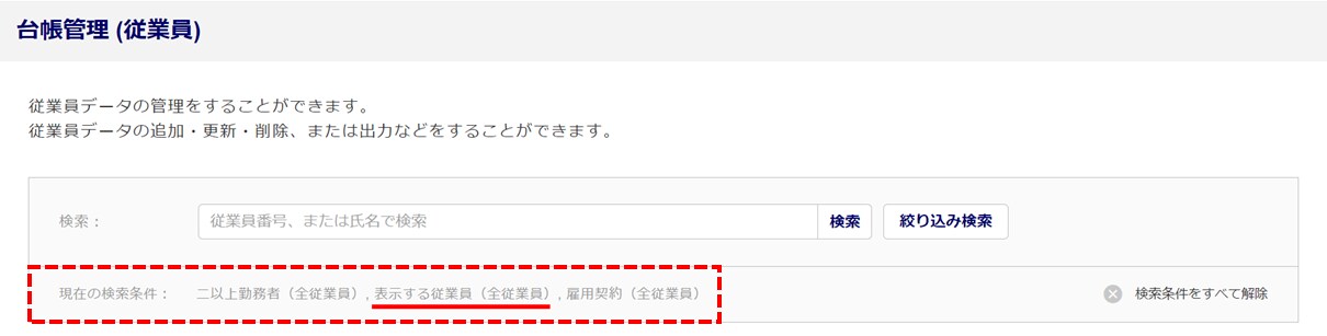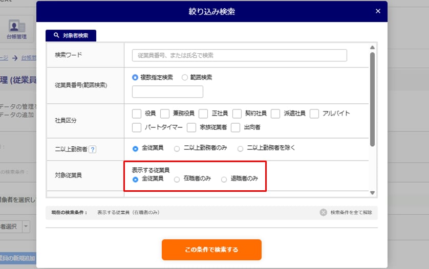 初期設定で「現在の検索条件」に「表示する従業員(在職者のみ)」が設定されています。