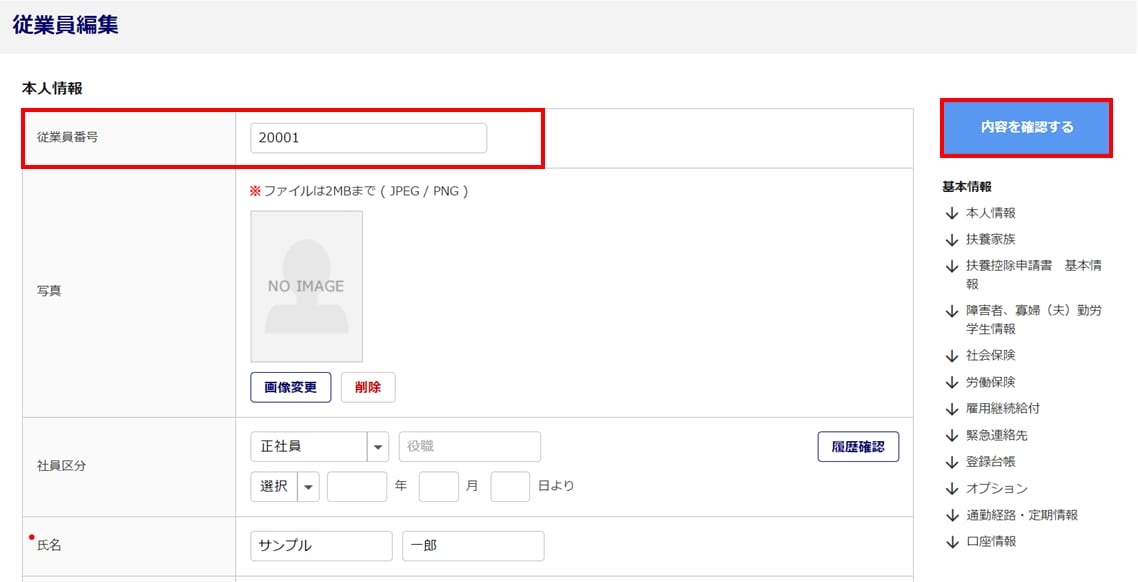 - 変更後の「従業員番号」を入力し、[内容を確認する]をクリックします。