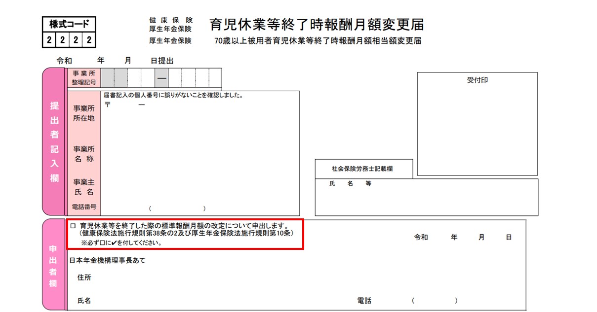 電子申請の仕様上、電子申請画面に「育児休業等を終了した際の標準報酬月額の改定について申出します」欄は設けられておりません。