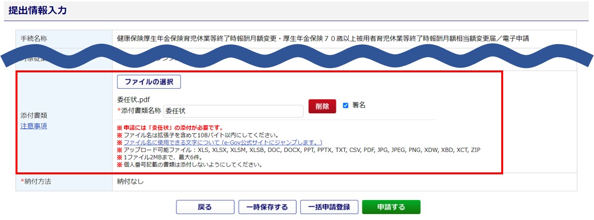 「提出情報入力」画面にて、「添付書類」に委任状を添付して申請してください。