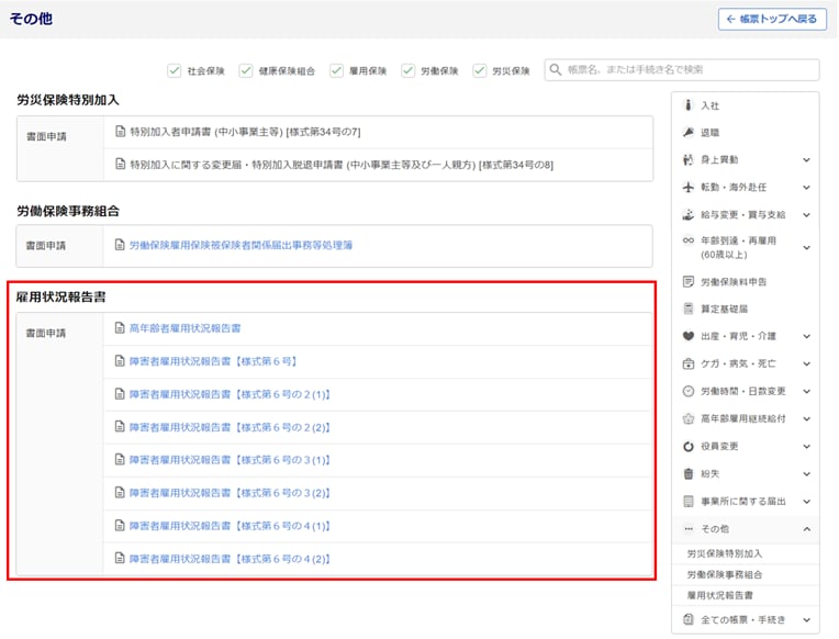 メインページ[帳票]>[その他]をクリックし、「雇用状況報告書」カテゴリ内から該当の帳票を選択し、作成します。