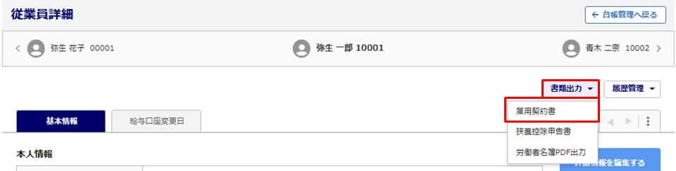 全従業員もしくは、複数の従業員の雇用契約書を出力する場合は、「一括で出力する場合」をご確認ください。