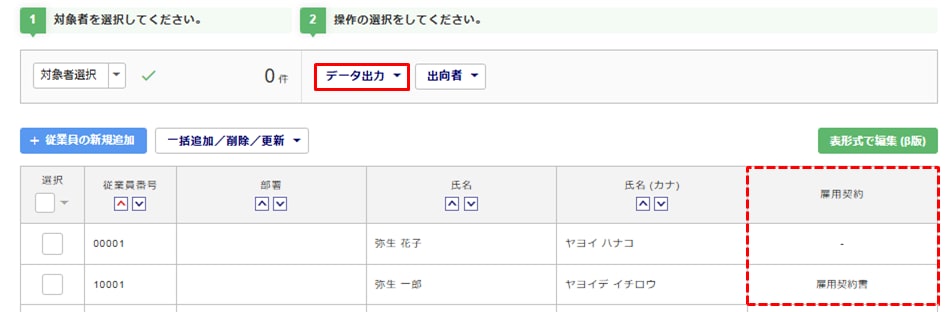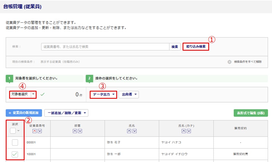対象従業員の「選択」列(②)にチェックをつけ、[データ出力](③)をクリックします。対象者の選択は、[対象者選択](④)から一括での設定もできます。従業員を選択せずに[データ出力]をクリックすると、全従業員の雇用契約書を出力します。