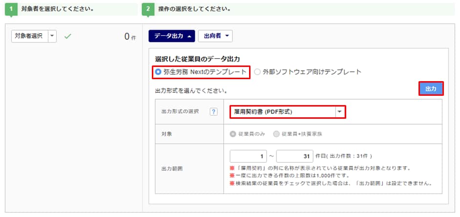 ※一覧の「雇用契約」項目が「-」の従業員は出力対象外です。 - 「弥生労務 Nextのテンプレート」、「出力形式の選択:雇用契約書(PDF形式)」を選択し、[出力]をクリックします。※一度に出力できる上限数は「1,000件」です。
