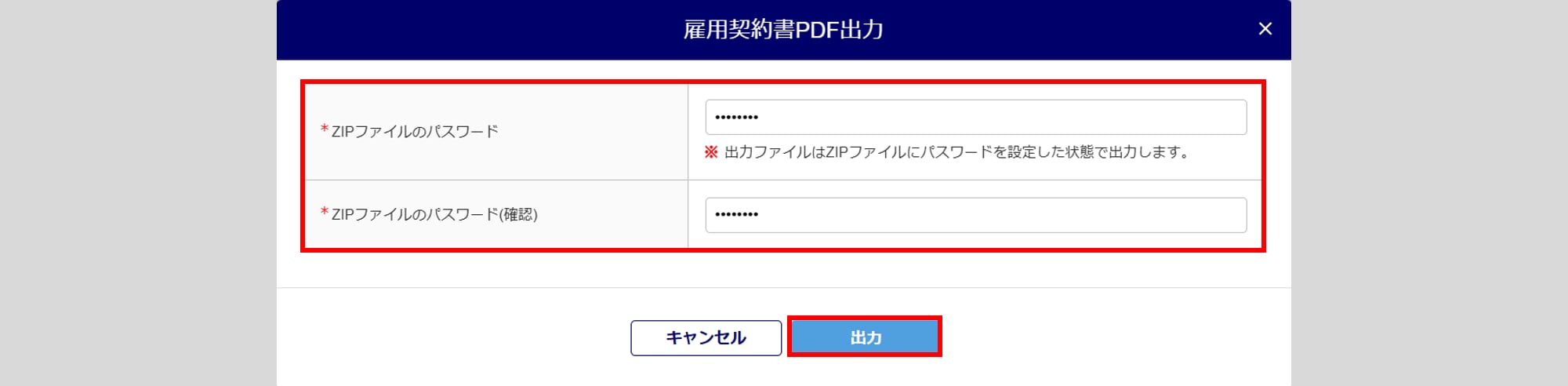 - 「ZIPファイルのパスワード」と「ZIPファイルのパスワード(確認)」を入力し[出力]をクリックします。※パスワードは最大100桁まで設定可能です。