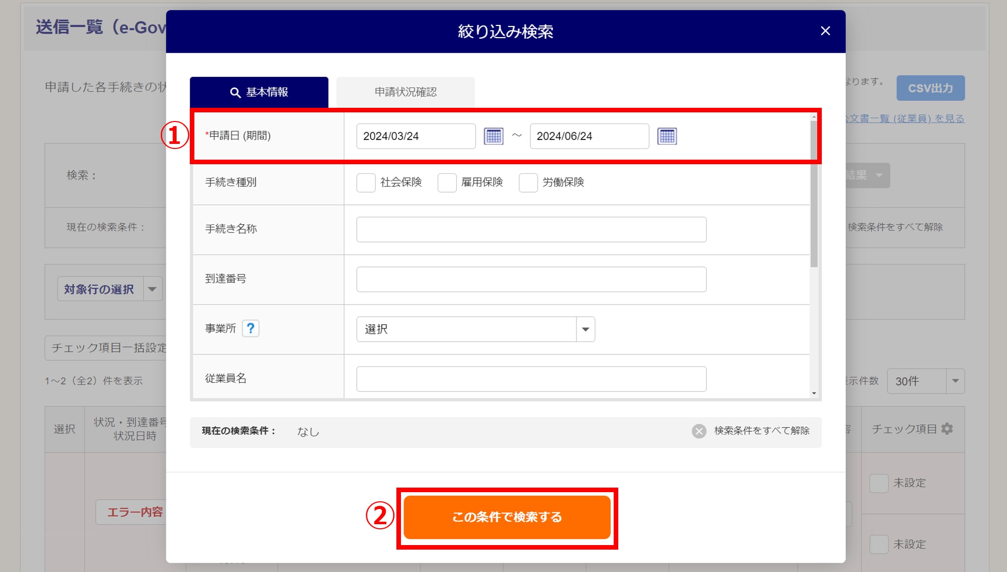 - 「申請日(期間)」(①)を設定し、[この条件で検索する](②)をクリックします。※「申請日(期間)」は3カ月以内で設定してください。3カ月を超えての検索には対応しておりません。