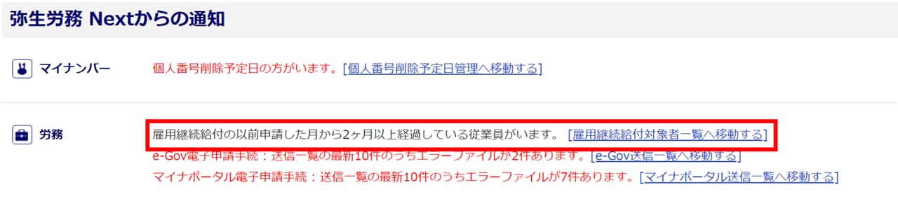 「雇用継続給付」アラート(弥生労務 Nextから通知される「雇用継続給付の以前申請した月から2ヶ月以上経過している従業員がいます。)については、前回申請をおこなってから2ヶ月経過した際に表示されます。