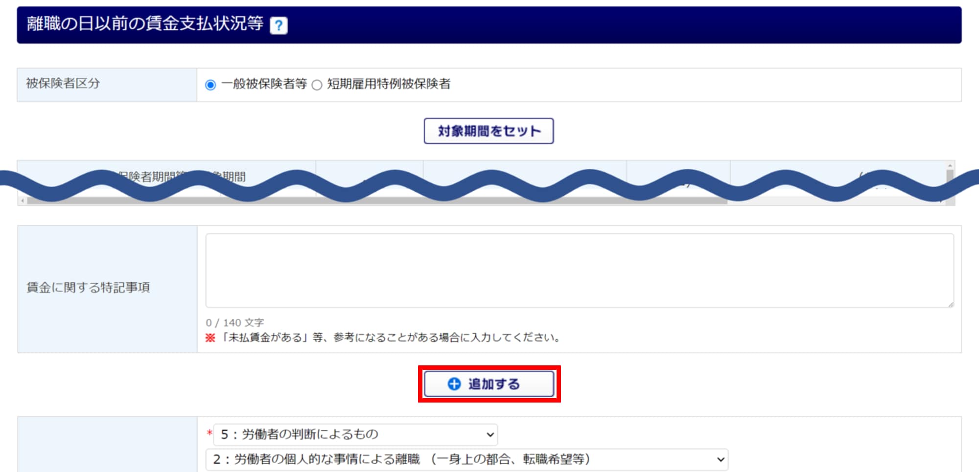 「離職の日以前の賃金支払状況等」カテゴリ下部の[追加する]をクリックすることで追加できます。